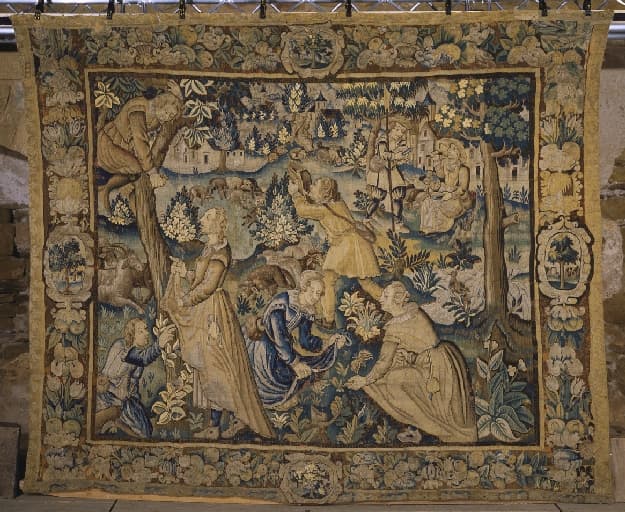 Pièce murale (tapisserie) : Gombault et Macée, la cueillette (4e pièce), suite de cinq tapisseries