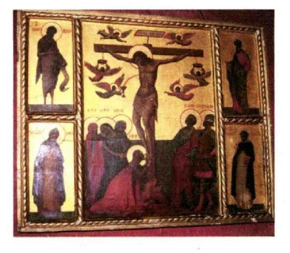 Peinture sur bois sur fond doré à cinq compartiments. Le panneau central représente la crucifixion avec la Vierge soutenue par les apôtres et Marie-Madeleine au pied de la Croix, six anges entoure le Christ dont trois recueillent son sang ; les panneaux latéraux montrent quatre figures de saints.