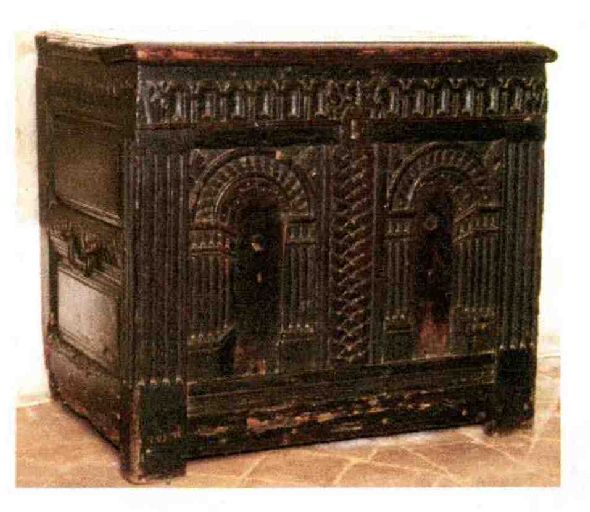 Petit coffre avec poignées latérales ; sculpté sur la face avant de deux pilastres cannelés, de deux arcatures en perspective avec voûte à caissons, séparées par une large tresse ; une frise de petite arcatures court sur les trois faces.