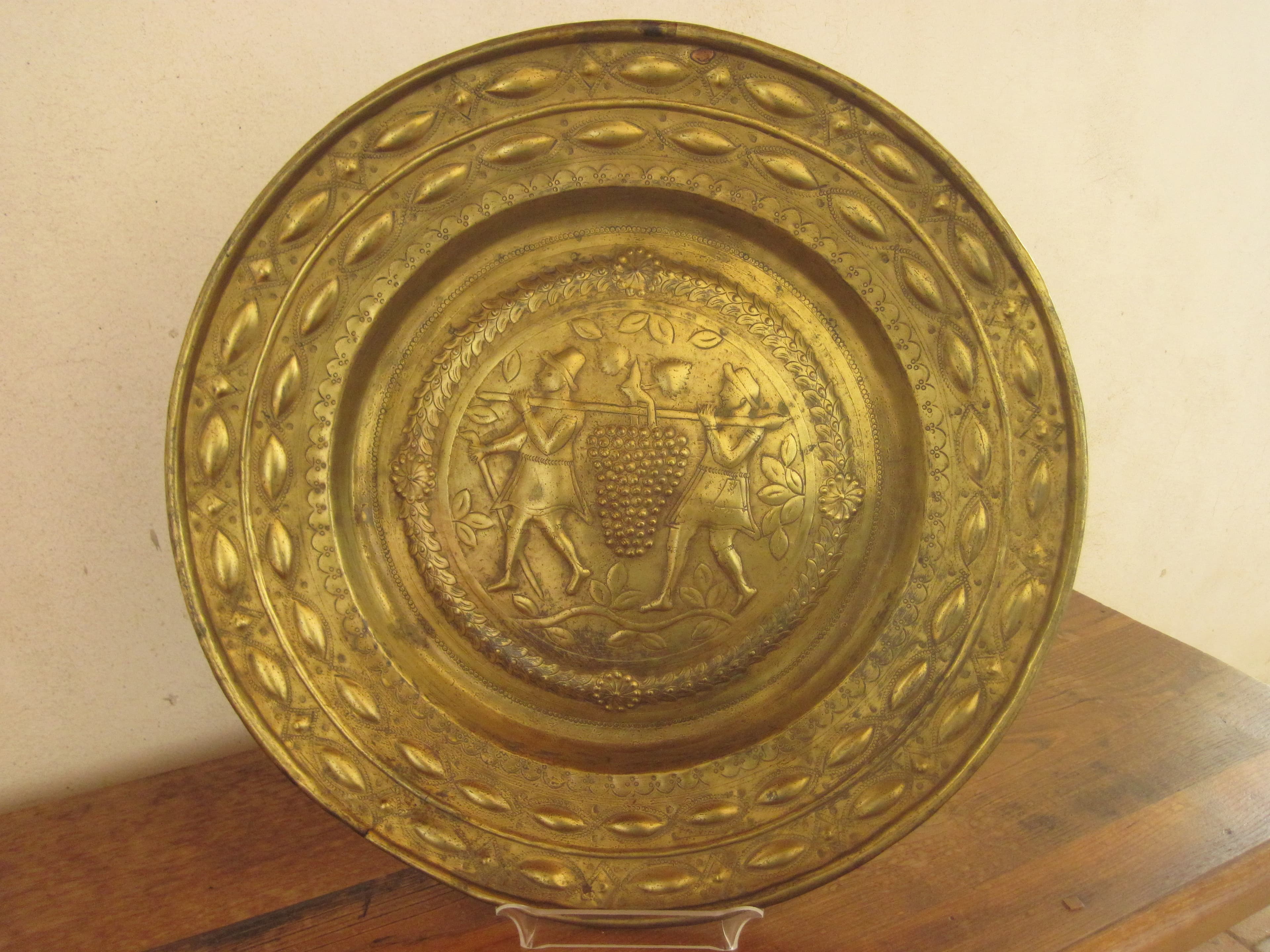 Plat à fond bombé décoré de deux personnages portant sur les épaules la grappe de Chanaan (raisin) suspendue sur un bâton encadré d'une couronne de feuilles de laurier ; sur le marli, deux rangs de bossages en forme d'olives séparés par un filet saillant.