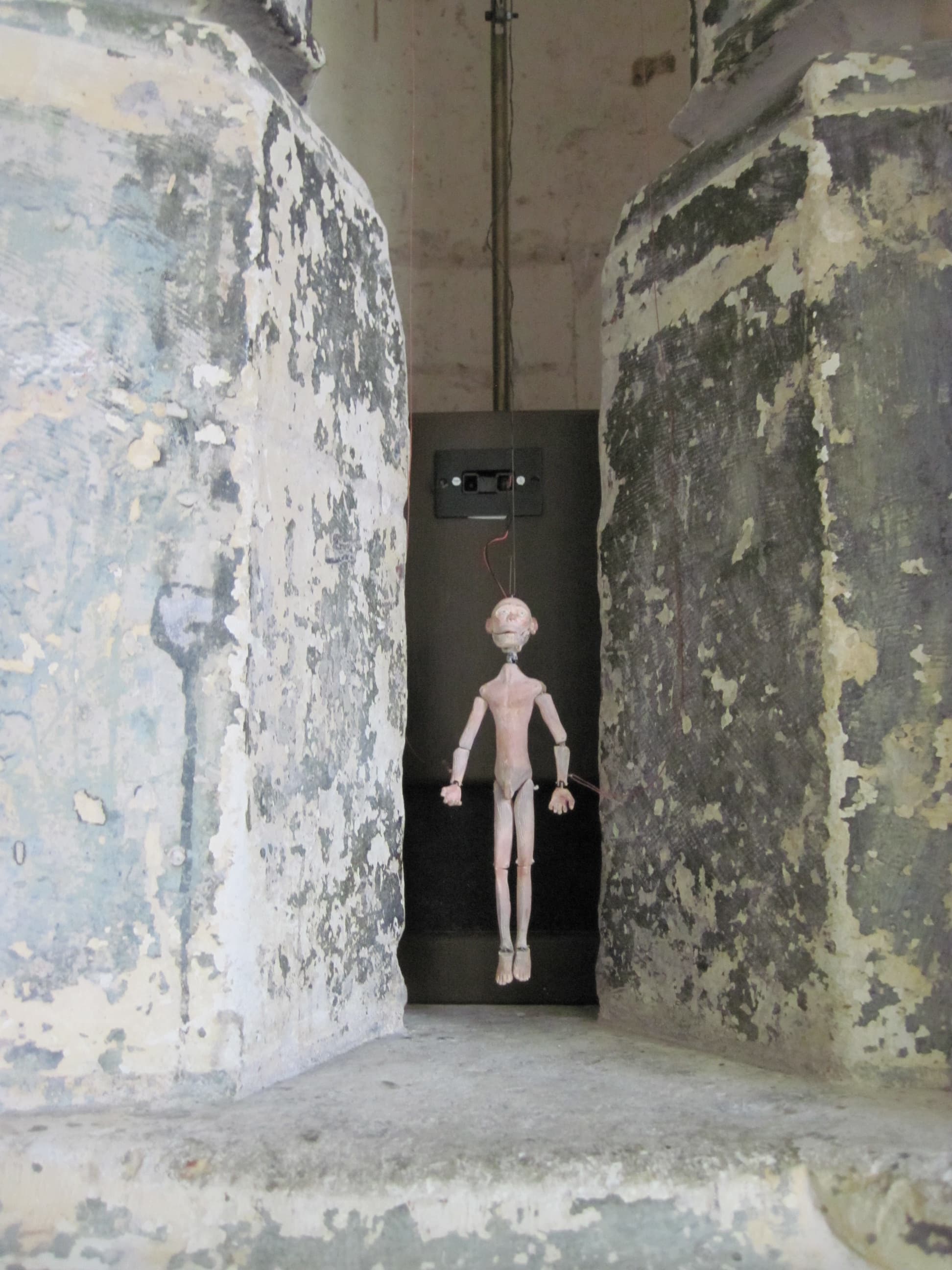 Petite silhouette articulée par une machinerie sonore délivrant un discours absurde construit à partir des textes du catalogue de la collection du château d'Oiron. Un caisson en bois, situé à l'arrière, abrite le dispositif technique et un bras d'articulation au-dessus actionne la marionnette.