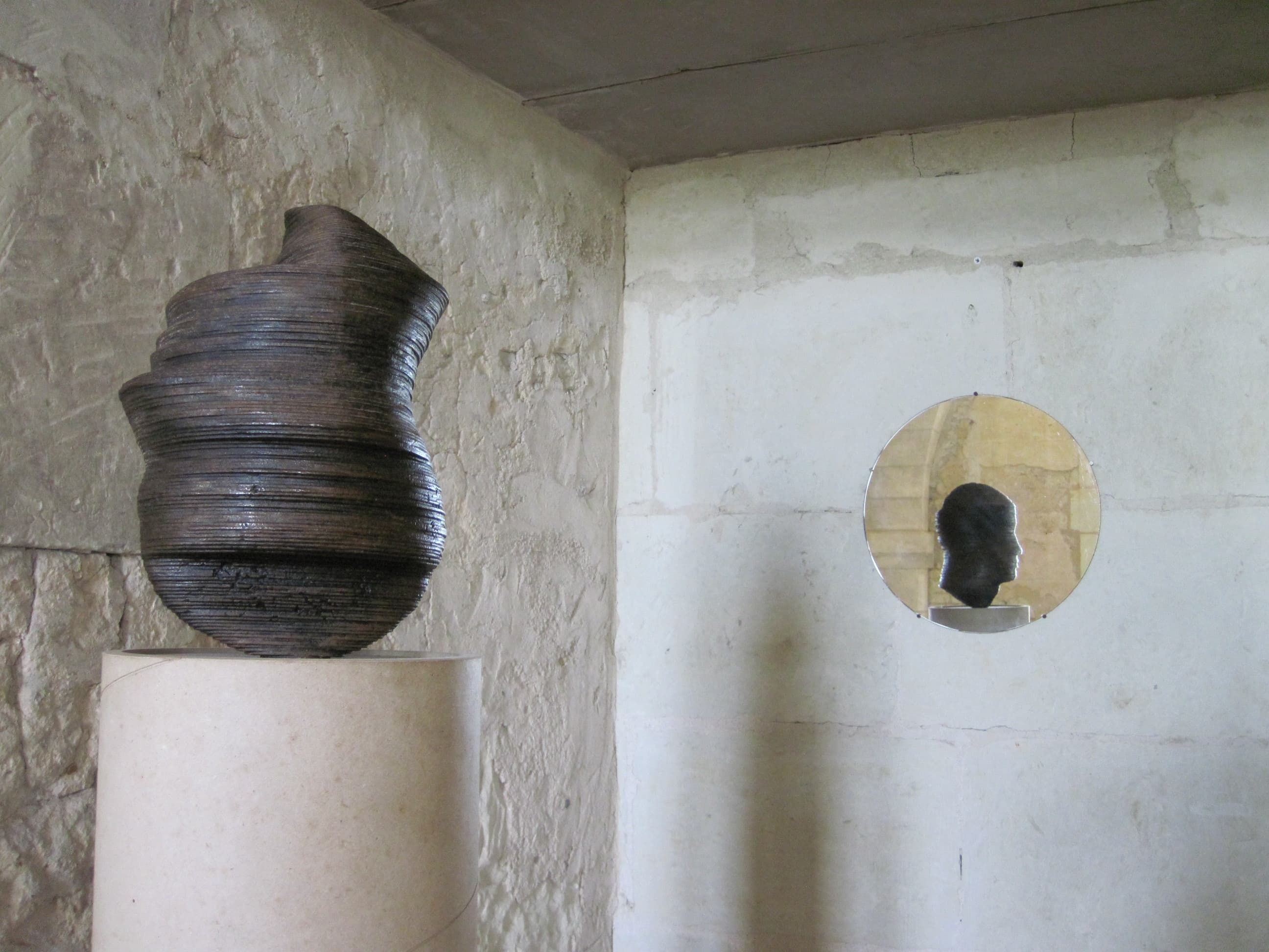 Installation comprenant un socle constitué d'un cylindre en carton sur un pied en contre-plaqué supportant une tête en fonte réalisée d'après un modèle en contre-plaqué. L'image inversée de cette tête posée à l'envers sur le socle se réfléchit dans un miroir rond convexe fixé au mur, restituant une vision normalisée de la sculpture.