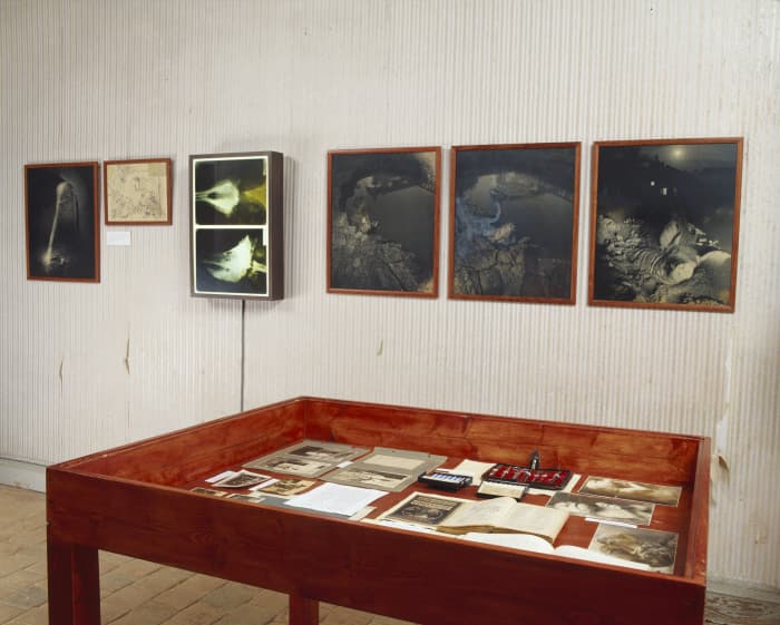 photographies ; art vidéo ; table-vitrine ; vases de pharmacie
