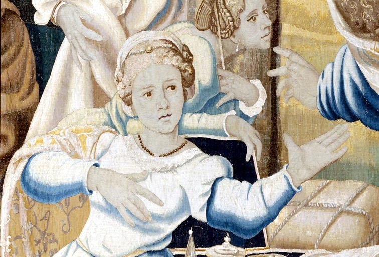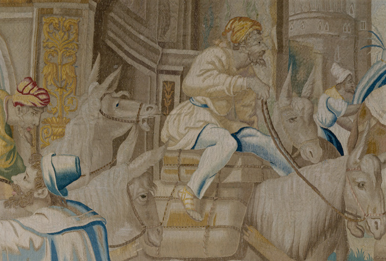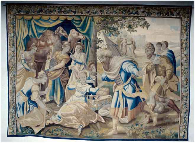 scène biblique (Laban, Jacob, Rachel, femme : servant, chameau)