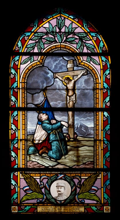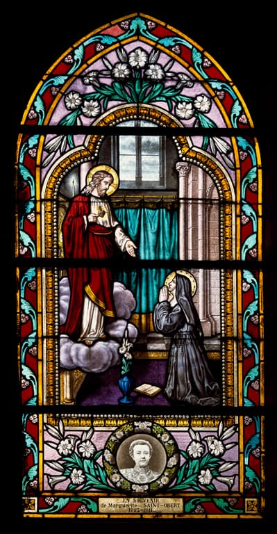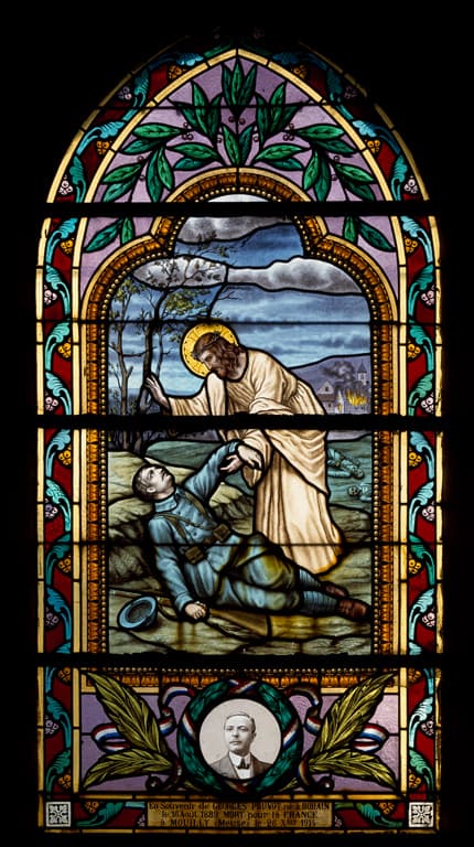 POP | Plateforme ouverte du patrimoineEnsemble de 6 verrières (vitrail tableau) : Apparition du Christ à sainte Marguerite-Marie Alacoque, apparition de la Vierge à Bernadette Soubirous, Assomption, Christ bénit un soldat (le), soldat tombant devant un Christ en croix, Christ bénit un soldat mourant (baies 5 à 10)