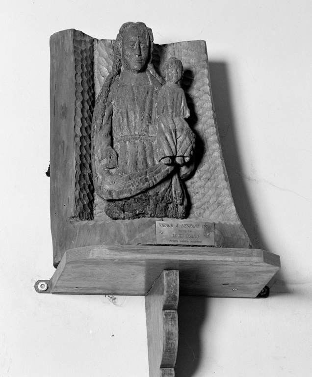 inscription gravée sur plaque de cuivre, placée lors de la restauration de l'oeuvre : VIERGE A L'ENFANT (1724) /REVUE PAR/LOUIS CORNU/ARTISTE PEINTRE SCULPTEUR.