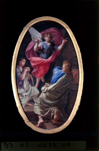scène (ange, personnage) ; scène (couronnement, saint Crépin, saint Crépinien, ange, palme)