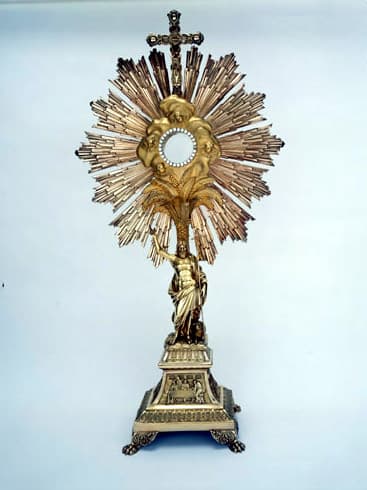 Pied rectangulaire sur quatre griffes ; tige en forme de palmier avec saint Jean-Baptiste bénissant ; gloire entourant nuage avec quatre angelots ; croix