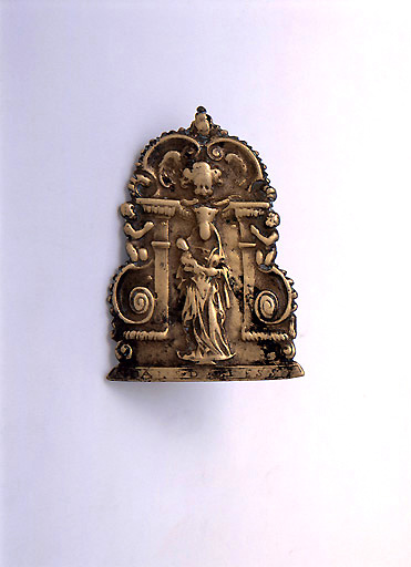 Vierge à l'Enfant, en pied, de face, angelot, de profil ; ornement à forme architecturale (à aileron, à ordre antique)