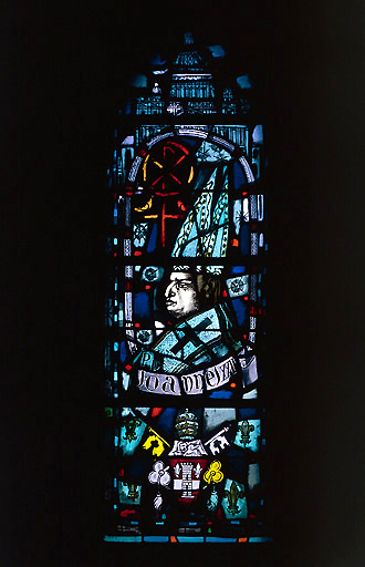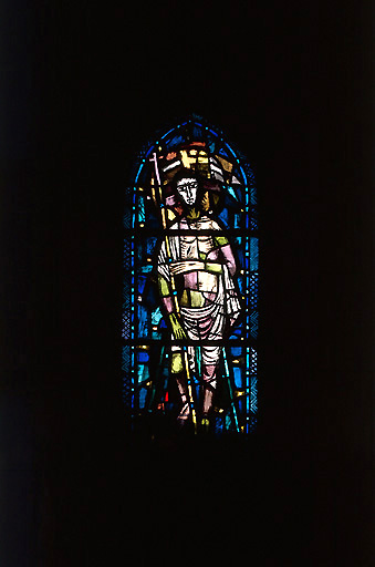 verre transparent (en plusieurs éléments, coloré) : peint, sanguine sur verre ; plomb (réseau)