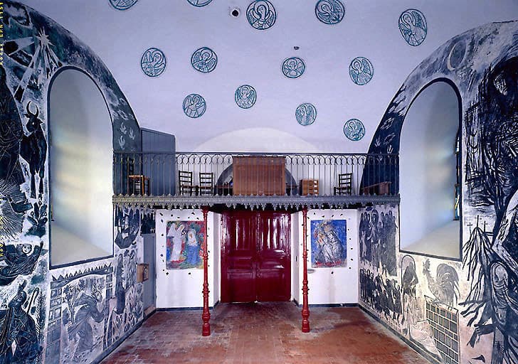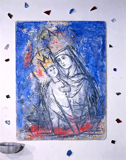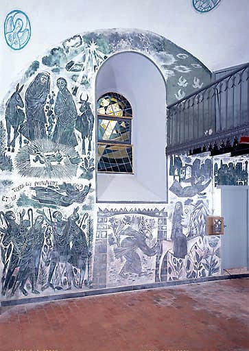 Peintures monumentales du narthex : Annonciation, Vierge à l'Enfant dite Notre-Dame de la Joie, Annonce aux bergers, Nativité, Fuite en Egypte, Jésus bénissant les enfants, Reniement de saint Pierre, Pieta, Anges
