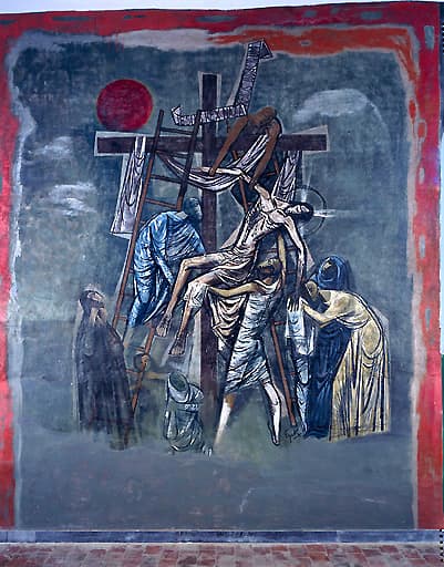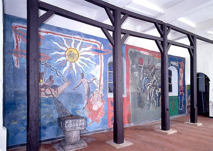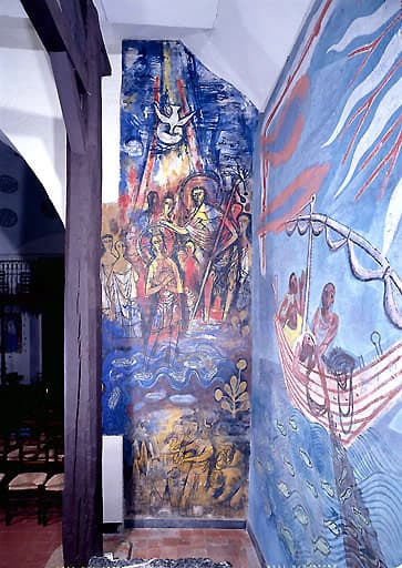 Peintures monumentales de la nef : Baptême du Christ, Moïse faisant jaillir une source, La Pêche miraculeuse, Descente de croix, Résurrection du Christ, Croix