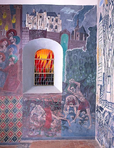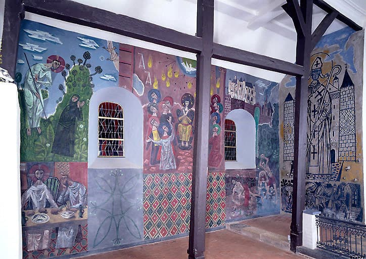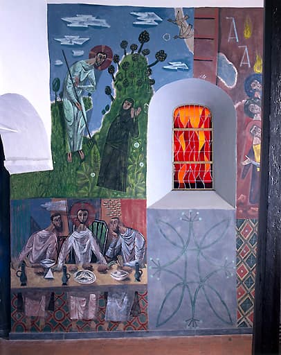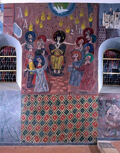 Peintures monumentales du choeur : Noli me Tangere, Les Pèlerins d'Emmaüs, La Pentecôte, Lapidation de saint Etienne, Vue des églises de Jeantes et Montcornet, Saint Martin, Charité de saint Martin