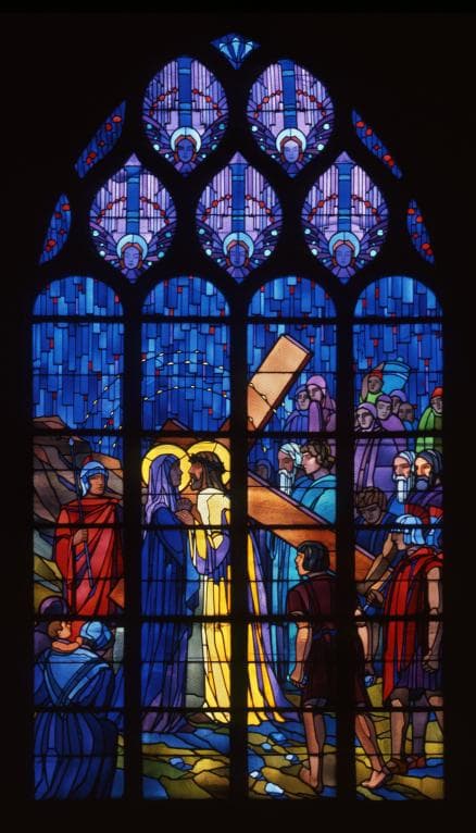 Verrière (vitrail tableau) de style Art déco : le Christ rencontre sa mère (baie 7)