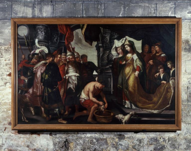 L’œuvre de Guise est une copie ancienne d'un tableau du peintre anversois Pierre Paulus Rubens (1577-1640). L’œuvre originale, datant du 1er quart du 17e siècle, est aujourd'hui conservée au Museum of Fine Arts de Boston. Rubens exécute une autre variante, vers 1620-25, dans une œuvre aujourd'hui conservée au Musée du Louvre. Le tableau de Rubens, dans sa richesse de coloris, son inventivité formelle et son savoureux orientalisme connaît très vite une grande notoriété, renforcée par la diffusion de gravures. Cette notoriété est attestée par le grand nombre de copies ou de tableaux s'inspirant totalement ou pour partie du tableau de Rubens. Le tableau de Guise, attribuable à un peintre relevant de l'école flamande, est dans le sens inverse de la composition originale, il a probablement été exécuté d'après la gravure de l'anversois Paulus Pontius (1603-1638). Collaborateur de Rubens, il a en effet reproduit sous forme d'estampes une grande partie de l’œuvre de celui-ci, dont cet épisode de l'histoire de l'Empire perse. La copie de Guise a vraisemblablement été réalisée vers le milieu du 17e siècle. Son iconographie est liée au développement des œuvres illustrant les valeurs des femmes fortes de l'Antiquité, que le 17e siècle, à la suite de nombreux exemples littéraires ou artistiques depuis le Moyen-Âge et la Renaissance, s'est plu à exalter. Présentant encore des réminiscences de la peinture maniériste anversoise dans les attitudes des personnages, le décor architecturé aux colonnes salomoniques, et l'accent mis sur un orientalisme de fantaisie, particulièrement perceptible dans les costumes issus de l'observation des Turcs, ce tableau est aussi un prétexte à opposer les figures masculines et féminines, le groupe des guerriers à celui de la reine Thomyris accompagnée de sa cour. Ce dispositif théâtralisé laisse au centre la figure du bourreau exécutant sa macabre besogne, l'horreur d'un tel acte étant renforcée par le détail pittoresque d'un chien, un lévrier, semblant s'approcher du baquet pour le renifler. L’œuvre témoigne du grand talent de coloriste du copiste, dans sa large gamme chromatique assourdie dans les rouges, ocres et gris. La figure du bourreau semble avoir fait l'objet de restaurations anciennes. Le tableau a été restauré et reverni en 1996-1997, tout comme son cadre qui ne paraît pas remonter au-delà du 19e siècle.