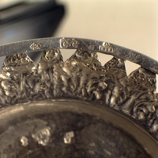 Trois poinçons sous la bâte et sous le pied : une petite fleur de lys couronnée, les initiales CC séparées par un point et couronnées, la lettre R surmontant la date 1733. Trois autres poinçons sous la coupe, dont un illisible et un autre à demi-écrasé : 1736 (?) ou 1758 (?) / P / AIX et le poinçon de maître : I P séparées par un grain, sous une fleur de lys et deux points.