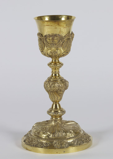 Les Vertus théologales, en buste, sont inscrites dans des médaillons circulaires sur la fausse-coupe, les symboles christiques sont représentés sur le pied, séparés par des palmettes. Les angelots se retrouvent sur la fausse-coupe, sur le noeud et sur la gorge du pied où ils alternent avec des rinceaux.