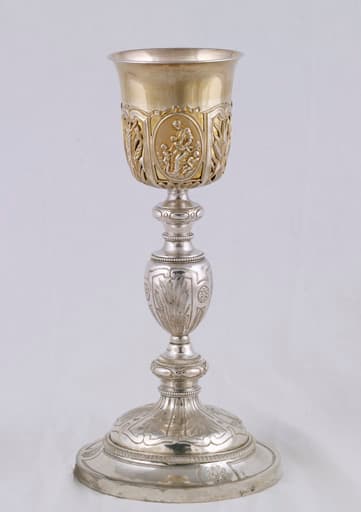 Calice en argent partiellement doré (uniquement la coupe) au décor repoussé, ajouré, ciselé et ciselé au mat. Le pied est circulaire, la tige est en balustre, le noeud de forme ovoïde. Le calice dispose d'une fausse-coupe. Il n'a plus sa boîte.