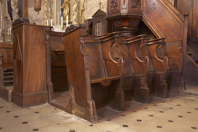 Le premier ensemble est composé de cinquante-trois stalles (n°6 sur le plan, dans la nef). Les stalles sont divisées en trois groupes distincts et chaque groupe est réparti sur deux rangées, dans la troisième travée de la nef, au-devant du choeur, séparées de celui-ci par la clôture de choeur. Les stalles sont toutes conçues de la même manière : entre deux parcloses aux appuis-mains en volutes et aux accotoirs chantournés, une sellette (abattant mobile), sous laquelle est fixée une miséricorde, sert d’assise. Les assemblages sont chevillés. Les charnières sont en fer. Les stalles hautes prennent appui sur le dorsal. Ce dernier comporte quatorze panneaux du côté sud et treize panneaux du côté nord. Tous ces panneaux sont moulurés grand cadre. Le décor sculpté se déploie essentiellement sur les appuis-main, les jouées et les miséricordes. Dans le choeur, se trouve le deuxième ensemble composé, du côté sud, de trois stalles basses et, en pendant, du côté nord, de bancs de choeur avec dorsal et un pupitre identique à celui des trois stalles. Les stalles comportent chacune un dorsal droit, des parcloses galbées, des accotoirs et une sellette mobile. Les sellettes n'ont pas de miséricorde. Les parcloses portent un décor en bas relief. Les assemblages sont chevillés et cloués. La face antérieure du grand pupitre, commun aux trois stalles, présente trois panneaux juxtaposés. Chaque panneau est mouluré. Enfin, toujours le choeur, côté sud, dans le prolongement des trois stalles basses, et en bordure de la clôture de choeur est placé le trône épiscopal aussi appelé cathèdre. Il est composé d'une stalle à dorsal avec un pupitre, des accotoirs galbés et un abat-voix à couronnement en noyer taillé et mouluré. Le dorsal est constitué d'un panneau à mouluration grand cadre qui est assemblé par des chevilles. Les faces extérieures des accotoirs portent un décor en bas relief. Le pupitre est légèrement convexe et la face antérieure du pupitre présente un panneau mouluré. L'abat-voix est surmonté d'un couronnement avec une croix sommitale. La stalle n'a pas de miséricorde.