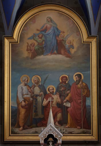 Vierge : en majesté ; saint Alexis ; saint Pierre : clef ; saint Paul : épée ; saint Abdon ; saint Sennen ; ange : harpe
