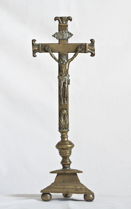 Croix d'autel en bronze fondu dont le pied triangulaire repose sur trois supports en boule, nœud en toupie. Christ et titulus rapportés.