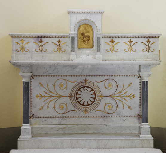Ensemble en placage de marbre gris, composé d'un autel-tombeau adossé et d'un gradin d'autel enserrant le tabernacle. La table d'autel, en débords, repose sur deux colonnes lisses. Décor gravé puis doré ou polychromé. La porte du tabernacle est en bronze avec décor rapporté.