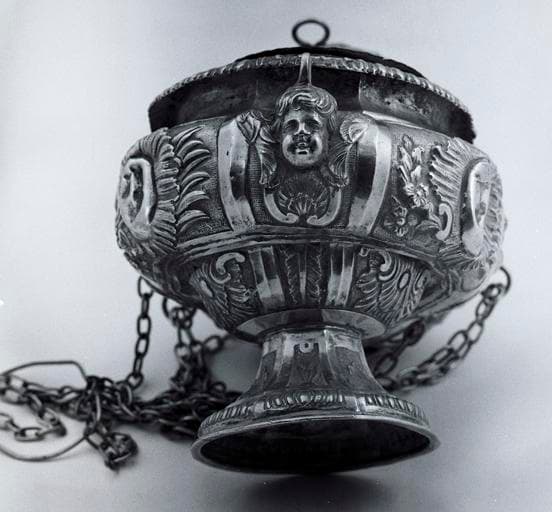 Angelots en haut relief. Anneaux fondus ; chaînes en métal argenté ; doublure en laiton argenté ; godet en tôle étamée.