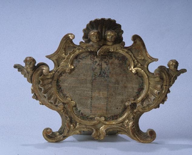 bois (en plusieurs éléments) : taillé, décor en haut relief, décor dans la masse, décor à relief en réserve, décor à relief gravé, doré à la feuille d'or ; papier : imprimé