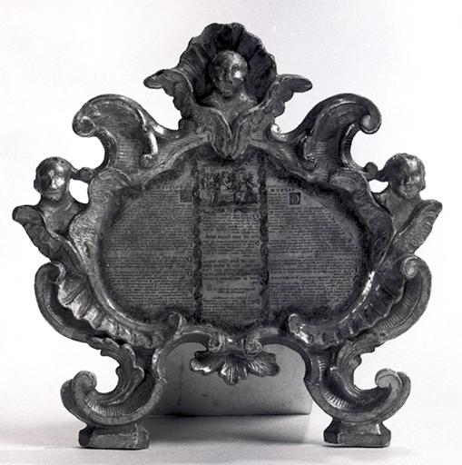 Cartouche rocaille flanqué d'angelots ; au sommet, angelot dans une coquille.
