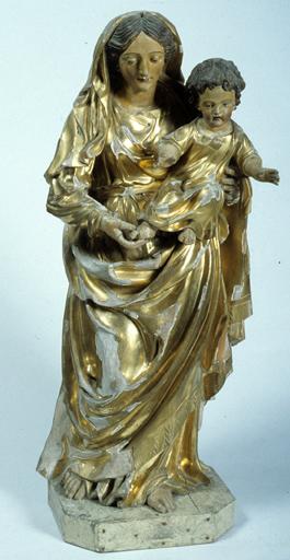 Bois fendu ; index droit de la Vierge cassé, doigt de pied et doigts de la main droite de l'Enfant arrachés ; dorure disparue par larges plaques. Cette oeuvre a été restaurée et redorée depuis l'enquête.