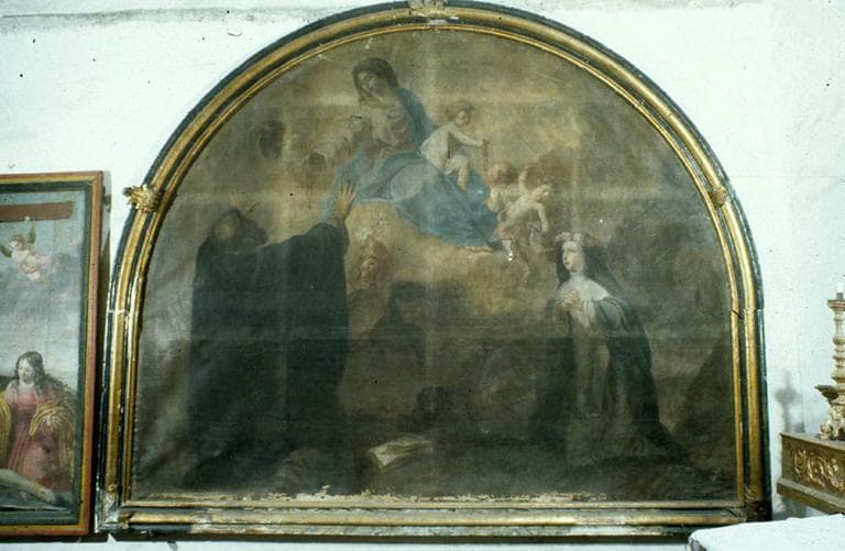 tableau : Remise du Rosaire à saint Dominique de Guzman et sainte Catherine de Sienne.