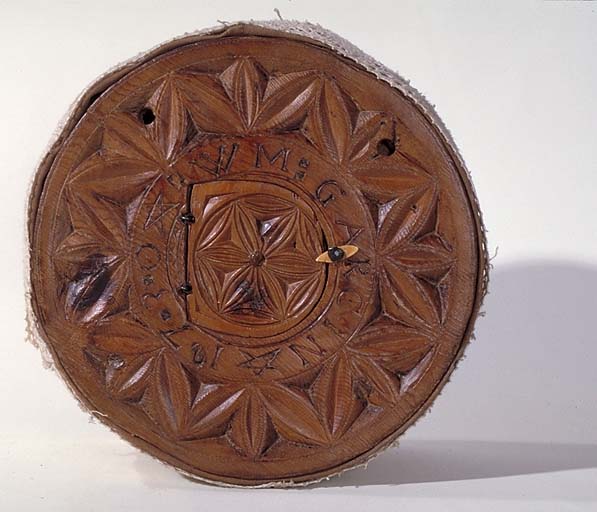 Métier à dentelle de forme cylindrique à axe horizontal. Les joues circulaires sont constituées de deux disques en bois. Ces disques maintiennent la tranche du métier qui sert de support au travail de la dentellière. Tranche étroite, rembourrée et recouverte d'un tissu fixé par des clous. Un tout petit battant de forme irrégulière occupe le centre de l'une des joues et permet d'accéder au coeur du tambour, qui sert de boîte de rangement pour les fuseaux. Ce battant comporte deux petites charnières. Chaque charnière est formée de deux anneaux en métal imbriqués l'un dans l'autre. Fermeture du battant par un petit taquet pivotant. Décor gravé et sculpté.