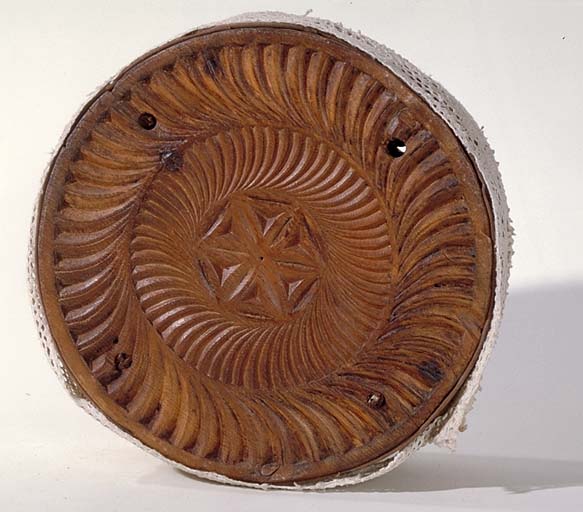 Le battant est orné d'une rosace. Autour de ce battant, un registres circulaire comporte une inscription et une date, de part et d'autre de laquelle deux étoiles à cinq branches ont été gravées (quelques dents de scie ont été gravées entre les deux charnières du battant). Registre circulaire périphérique orné de motifs géométrique. L'autre joue est ornée d'une rosace centrale autour de laquelle deux registres circulaires concentriques comportent des motifs géométriques.