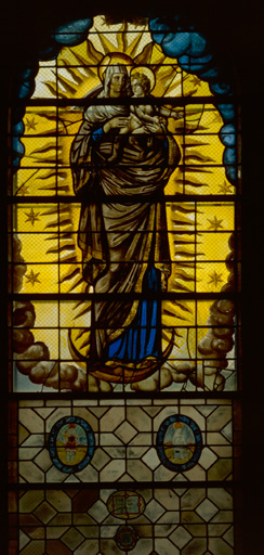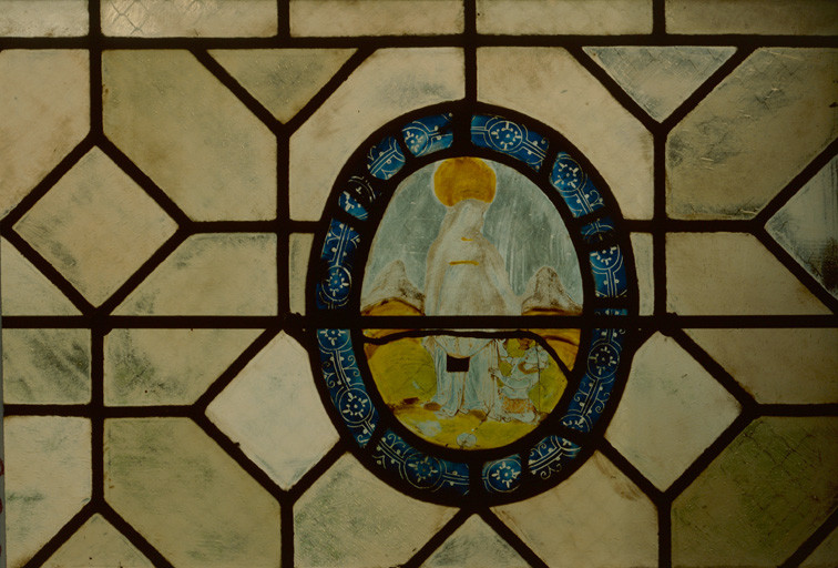 Panneaux peints en grisaille et jaune d'argent comportant quelques verres colorés : la robe et les nuages bleus de la Vierge à l'Enfant et les verres bleus gravés des bordures décoratives des médaillons ovales ; emploi de sanguine pour le médaillon montrant Charlemagne ; vitrerie à bornes de complément entre les médaillons (partie inférieure de la baie)