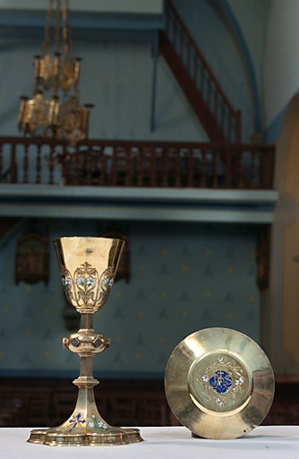 Les différents éléments constitutifs du calice sont entièrement en argent doré : coupe, tige, noeud et pied, ainsi que la patène. Le pied du calice est de forme circulaire polylobée, le noeud comporte 6 cabochons, la coupe ne comporte pas de fausse coupe. Le calice et la patène présentent un décor d'émail cloisonné polychrome en application en relief dans la masse. Le noeud qui présente un décor incisé imite les noeuds à cabochons des pièces médiévales, chaque cabochon comporte également un médaillon en émail cloisonné polychrome. Le décor en relief est également ciselé au mat et au trait.