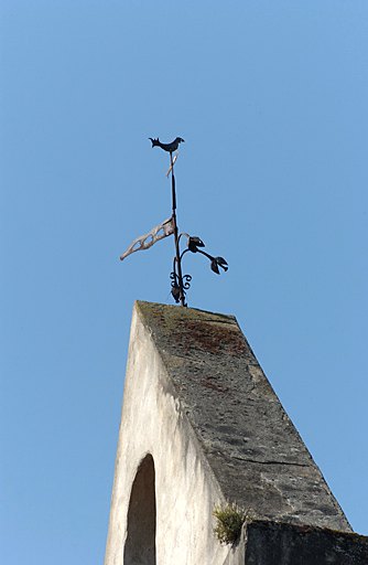 Cette girouette en fer forgé semble dater du 19e siècle. Elle est particulièrement remarquable par son décor à symbolique végétale et animale (coq). Elle a sans doute été exécutée par un forgeron local.