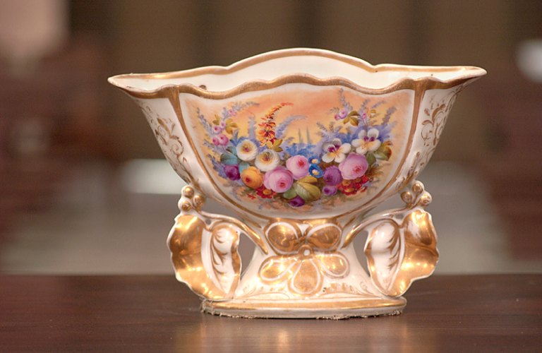 Les éléments en relief latéraux imitent un bouquet de fleurs et des rinceaux de feuillage et de fleurs. L'avers peint représente un bouquet de fleurs dont des roses trémières.
