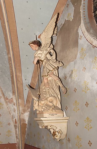 Les deux statues en plâtre de saint Michel et de sainte Jeanne d'Arc forment un ensemble avec la statue de l'Immaculée Conception. Celle-ci est encadrée par la statue en plâtre de Jeanne d'Arc qui avait été promue patronne de la Patrie à partir de 1870 et béatifiée en 1909 puis canonisée le 16 mai 1920 et la statue de saint Michel terrassant le dragon. Cette association de ces deux derniers personnages bibliques et patriotiques est plutôt propre aux monuments aux morts paroissiaux. La statue de saint Michel porte la signature du statuaire toulousain E. Lancé. La statue de Jeanne d'Arc a été exécutée d'après le modèle du sculpteur français Charles-Jean-Cléophas Desvergnes et édité par le fabricant et statuaire orléanais Marron. Ce dernier est particulièrement connu pour le monument aux morts qu'il édite au cours des années 1920 d'après un modèle du même sculpteur Desvergnes. Ce dernier a régulièrement travaillé avec Marron pour d'autres modèles de statues religieuses, en particulier un modèle de sainte Thérèse de Lisieux.