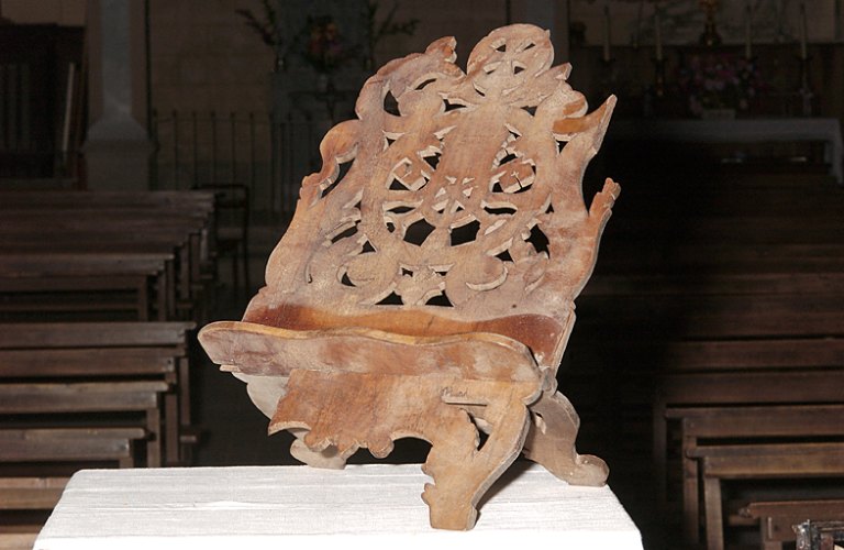 Ce pupitre d'autel pliant est constitué de 2 éléments de bois taillé, découpé et ajouré. Le pupitre comporte un décor découpé et ajouré. Il est peint de couleur faux bois. Il comporte 4 pieds à élévation galbée. La traverse inférieure est découpée et ajourée. Le bord du plateau permettant de placer le Missel est de plan chantourné, comme le dossier qui est de forme complexe.