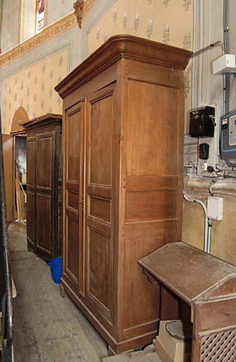 Ces armoires ou buffets hauts étaient très vraisemblablement à l'origine des meubles civils qui servaient peut-être d'armoire à linge. Elles pourraient dater de la 2e moitié du 19e siècle. La grande armoire a partiellement gardé ses garnitures en fer forgé. Elles servent aujourd'hui de meubles de sacristie.