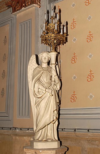 Ces deux statues d'anges lampadophores en plâtre peint polychrome ont vraisemblablement été livrés en même temps que le maître-autel néo-gothique. Placés sur les deux piédestaux le cantonnant, ils ne présentent pas de signature ou de marque permettant d'en identifier le fabricant. Il s'agit en effet d'oeuvres sérielles, semblables à celles proposées sur les catalogues de nombreux fabricants marchands de statuaire.