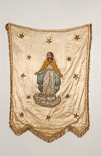 Cette bannière de procession date de la fin du 19e siècle ou du 20e siècle. Elle témoigne de la dévotion mariale liée à l'Immaculée Conception. Le type iconographique reprend celui dit de "la Médaille miraculeuse". L'oeuvre est actuellement déposée dans un placard de la sacristie, roulée en boule.