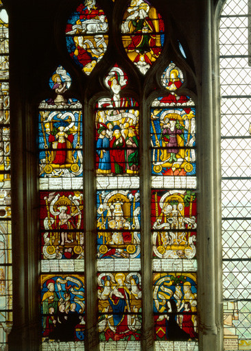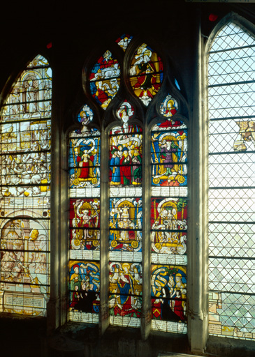 Description : baie centrale aux vitraux datés de 1502 montrant une composition allégorique où les figures de l'amour, de la chasteté, de la mort, de la renommée, du temps et de l'éternité se dressent sur des chars tirés par des animaux symboliques ; la Vierge du registre inférieur de la lancette centrale est une Vierge de l'Apocalypse terrassant le dragon ; 2 lancettes latérales furent ajoutées en 1537 : celle de gauche est ornée de scènes de la vie de Joseph et d'un saint Pierre entouré des Prophètes Ezéchiel et Daniel, et celle de droite possède des fragments dont un saint Phal ; sujet : selon Fichot, les vitraux disparus de la lancette latérale droite représentaient Joseph dans sa prison expliquant les songes du panetier et du maître sommelier au roi pharaon, le triomphe de Joseph et un écu armorié à 3 feuilles d'or.