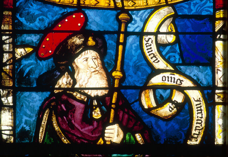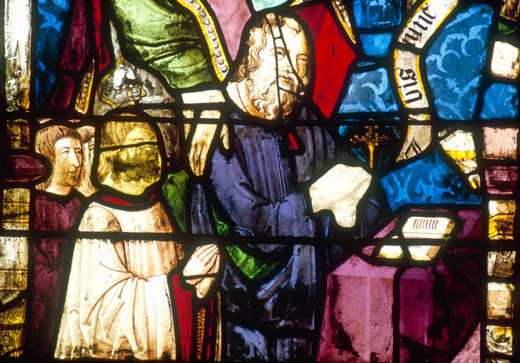 Verrière composite du 1er quart du 16e siècle qui montrait à l'origine le Baptême du Christ ; don de Jacques Vignier et de sa femme Anne