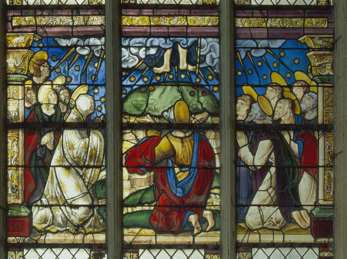 Tympan à 7 ajours et écoinçons.£Bordures en grisaille sur verre et jaune d'argent alternant avec des verres colorés ; scène en verre translucide (coloré), étoiles du fond montées en chef-d'oeuvre