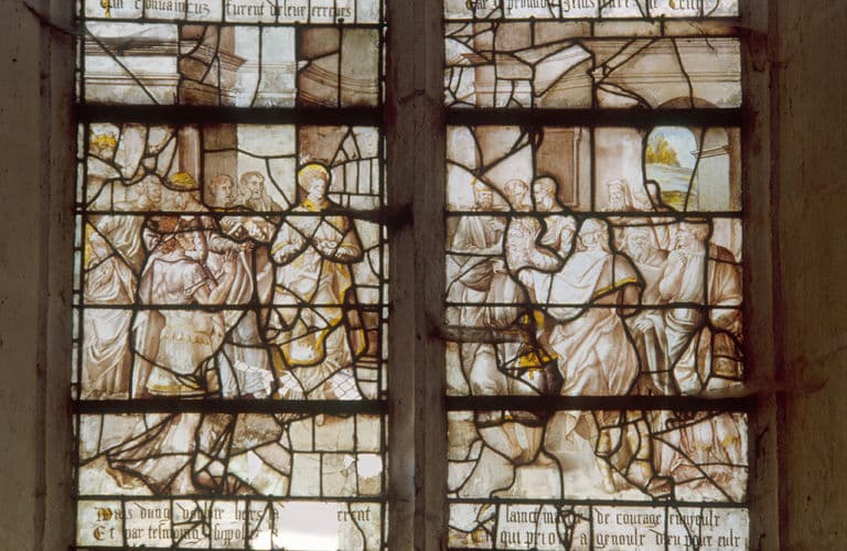verrière (grisaille figurée, verrière hagiographique) : vie de saint Etienne (baie 12)