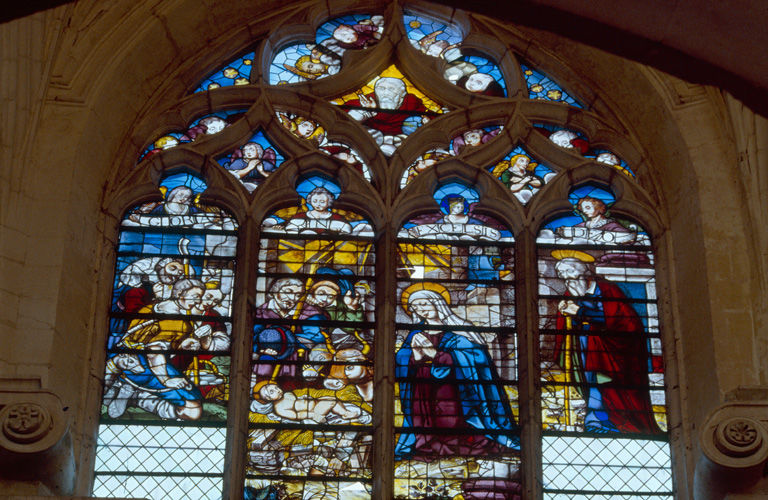 Verrière de l'Adoration des bergers du 3e tiers du 16e siècle qui fût très restaurée aux 19e 20e siècles