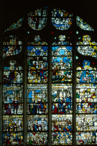 Tympan à 6 ajours et écoinçons ; 4 registres ; verrière peinte en verre coloré, exceptées deux parties en grisaille et jaune d'argent : l'élément d'Assomption situé à droite registre inférieur (quelques verres colorés), et les fragments du 2e registre