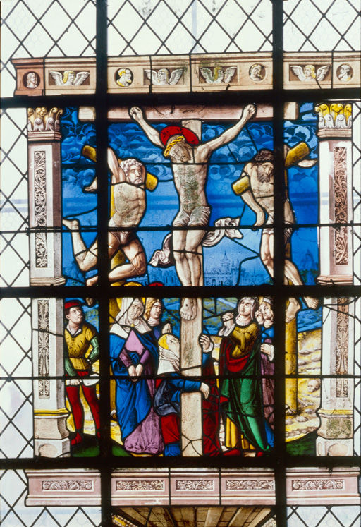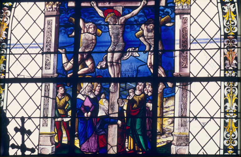 scène (femme : en donateur, Léon III) ; Calvaire, Les saintes femmes, sainte Madeleine, Vierge, saint Jean, bourreau, Les larrons ; ornementation : en encadrement (pilastre, angelot, médaillon : à l'antique), en bordure (ornement à forme végétale)