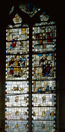 Verrière composite portant la date de 1527 ; les bordures des 2 registres supérieurs des lancettes datent du 20e siècle